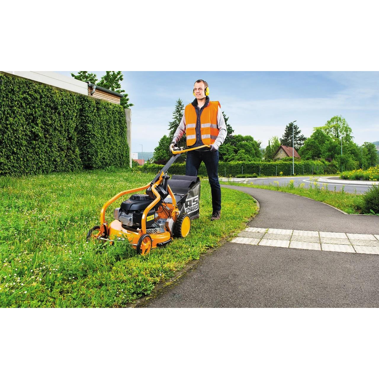 Profi-Rasenmäher mit Sicherheitsbremse.