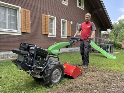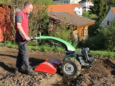 - Selbst in harten Böden selbstständiges Einziehen der Fräse durch gegen die Fahrtrichtung drehende Messer