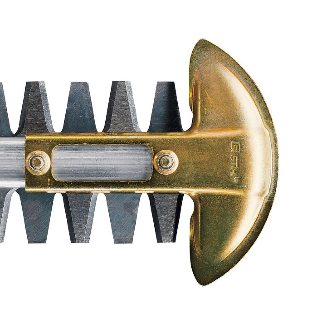 Der Führungsschutz schützt die Spitze der Heckenscherenmesser vor Verschleiß bei Arbeiten mit Bodenkontakt.